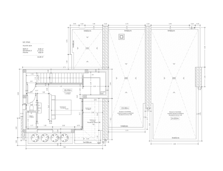 The volumetric play is achieved by combining changes in interior heights, protruding floors that create overhangs and porches, and walls that define spaces. This helps differentiate spaces and generate a richness of space both inside and out.