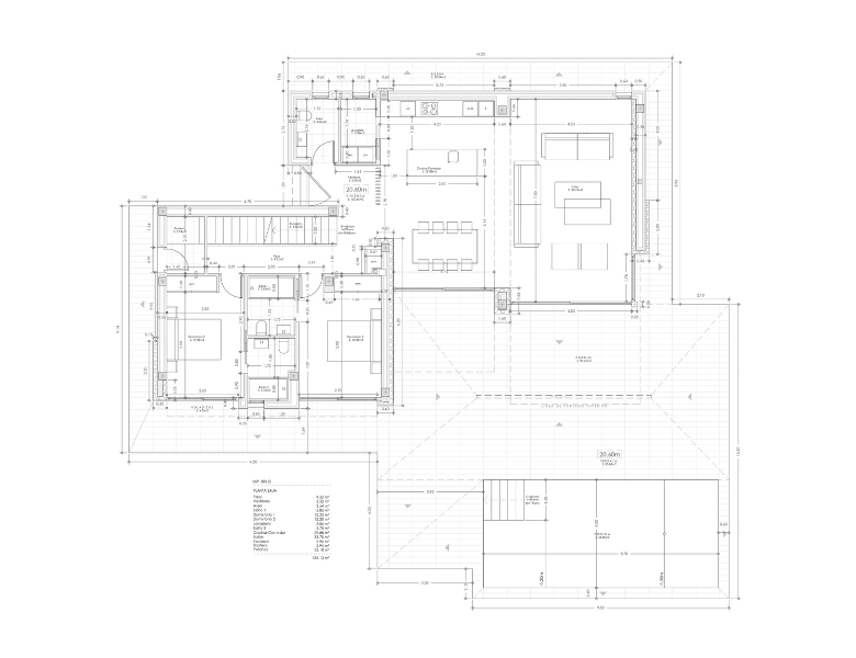 Access is through a welcoming foyer, which organizes the ground floor spaces. The kitchen-dining area is the first to unfold, followed by the living room, which boasts higher ceilings, enhancing the sense of openness and light. These interconnected spaces form the social hub of the home, seamlessly extending toward the pool and outdoor area through expansive openings.